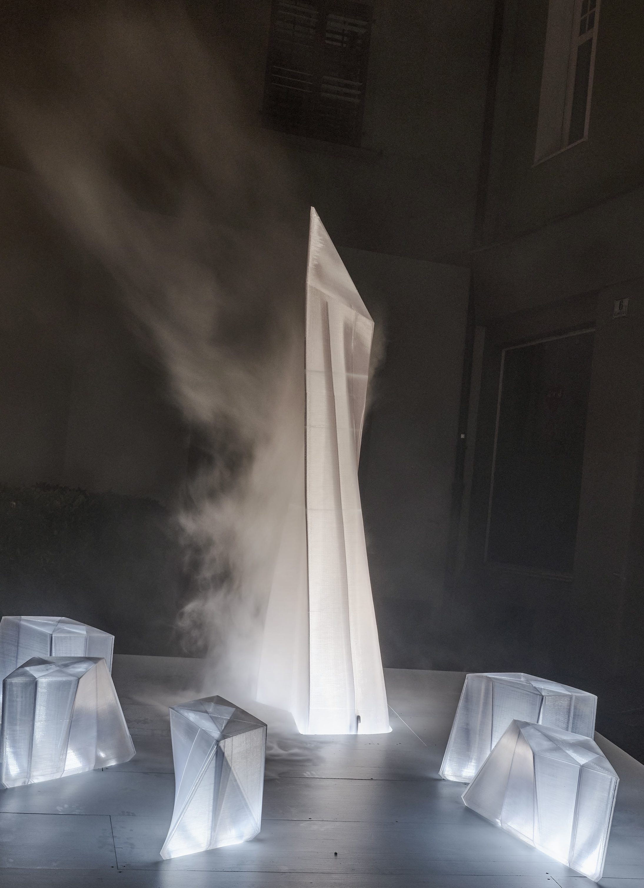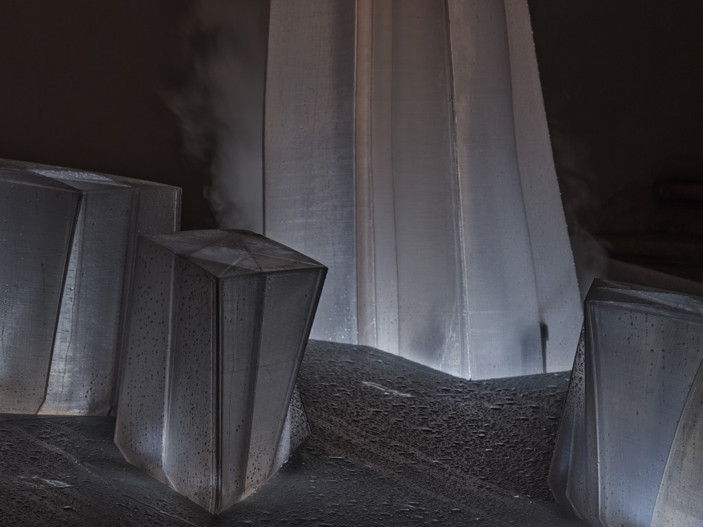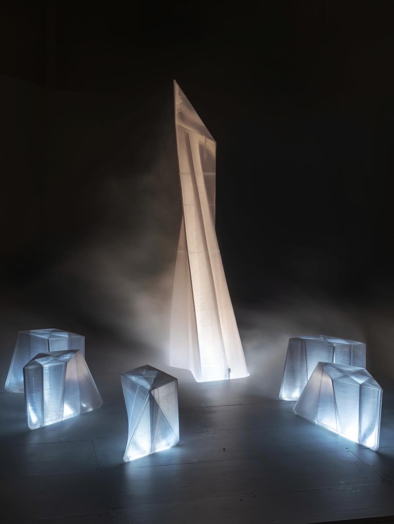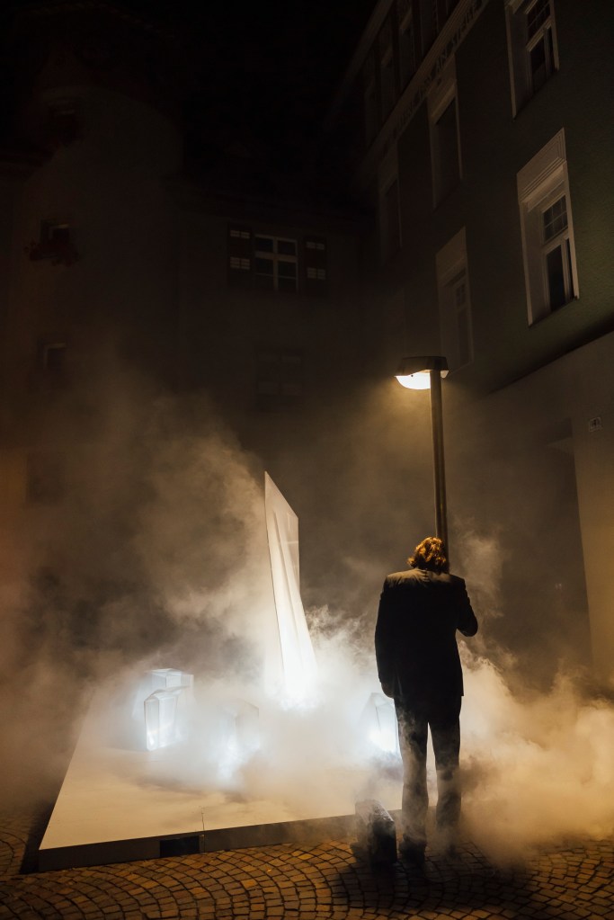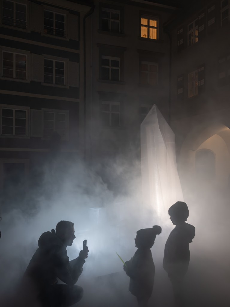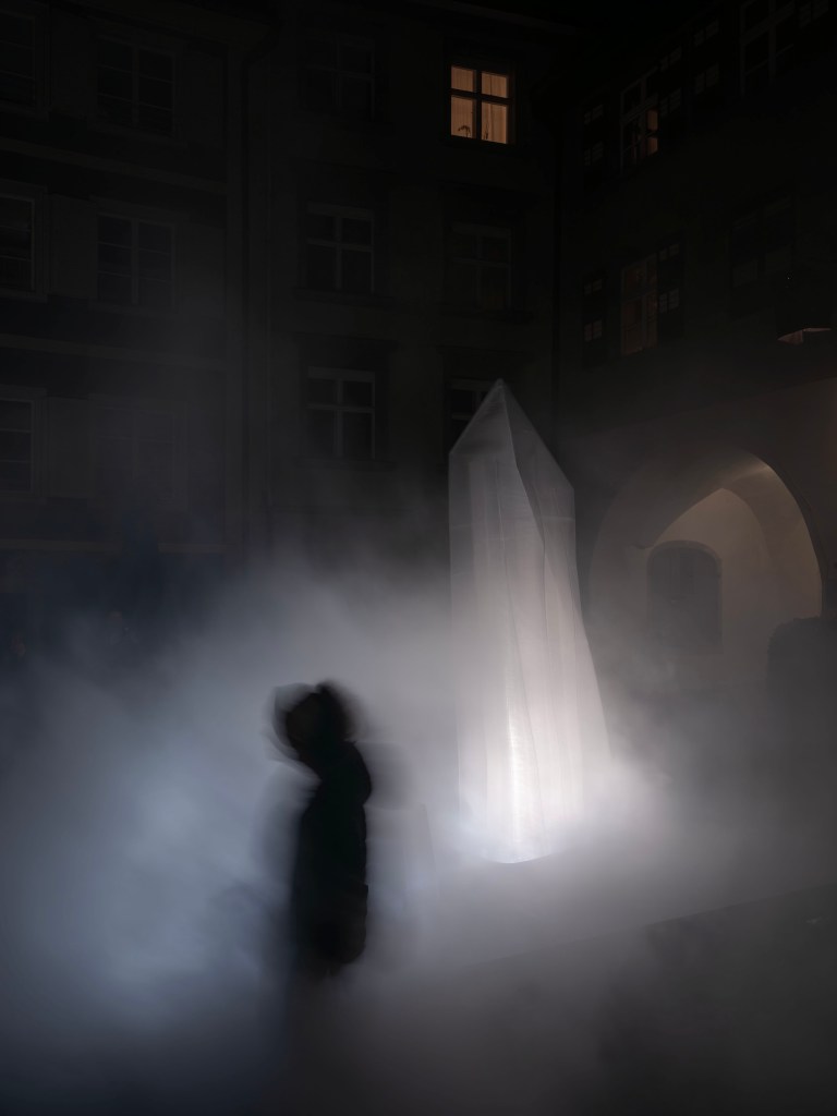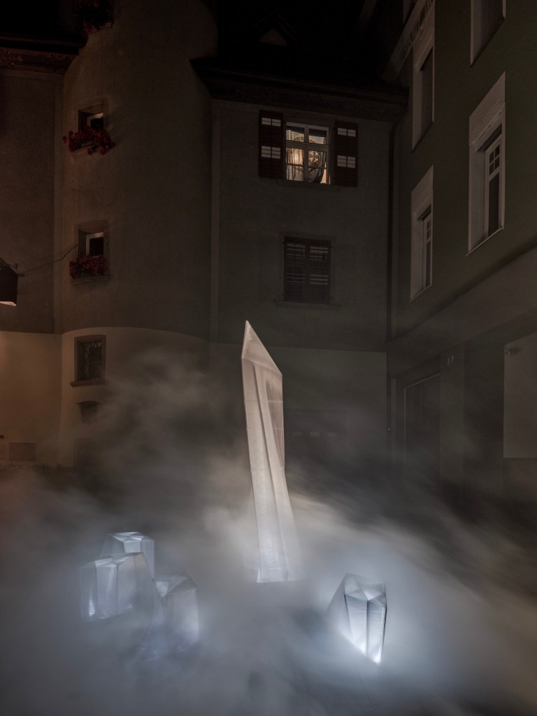 Inspired by its original site at the Churer Tor, an epicentre of salt trade in Western Austria, “Crystalline” features a 2.7m tall, illuminated salt crystal, accompanied by smaller crystals, all of which are crafted from recycled medical plastic waste using advanced 3D printing technology. These sculptures are not only visually striking but also incorporate specifically designed light elements that interact with the surrounding architecture, creating a dynamic and immersive experience, and an ephemeral soundscape composed by artist LouLou Raven for Spotlight ’24, and The Sound Nutritionist for Lichtstadt ’25.