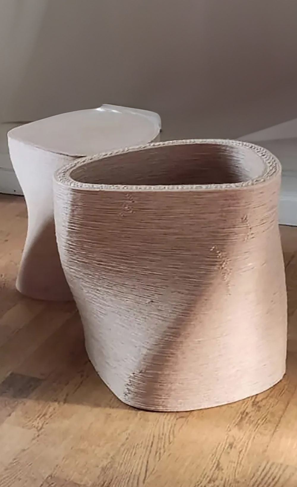Sculpted Simplicity: Made of 3D printed fermented sugar and wood fibre, Swivel is a dual-use stool and planter developed for Greenwich Peninsula, and launched for the public at the London Design Festival 2022.